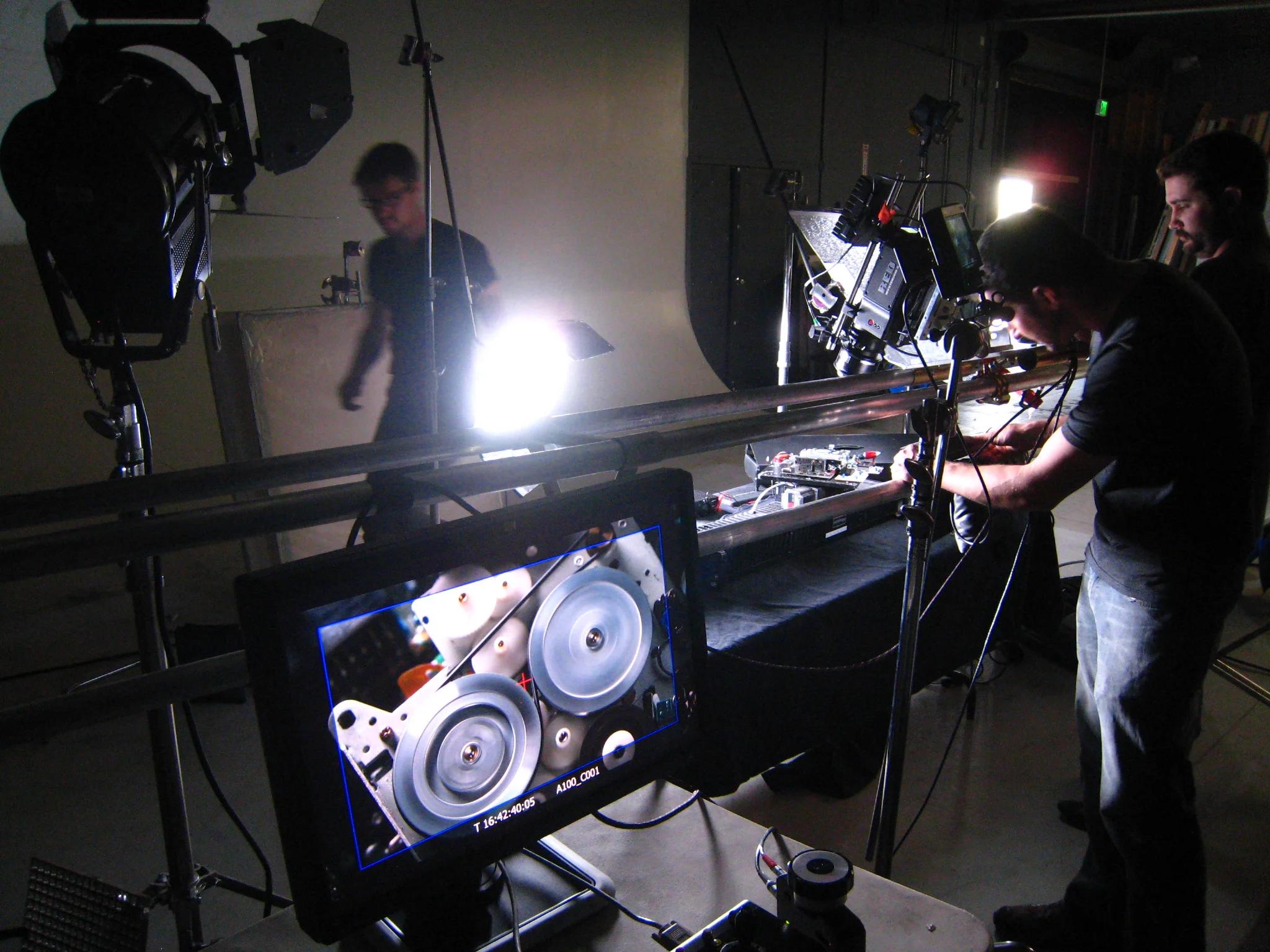 And here I am adjusting something (who knows what) on the motion control rig. That’s Brett, our DP, on the right.
